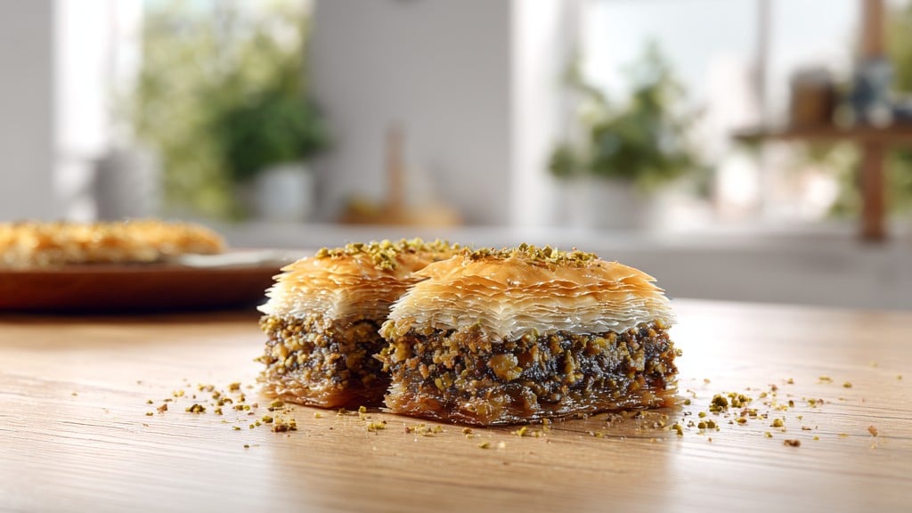 A rich and sweet pastry made of layers of phyllo dough filled with nuts and sweetened with syrup.