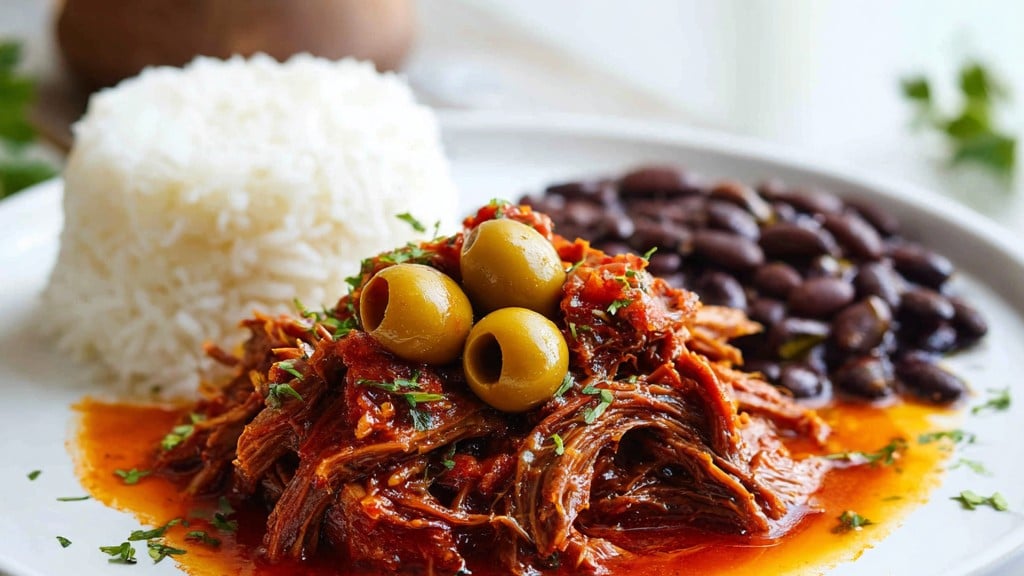 •A traditional Cuban dish of slow-braised shredded beef with peppers, olives, tomato, and warm aromatic spices. The sauce should reduce to a rich, glossy coating rather than a soup.
